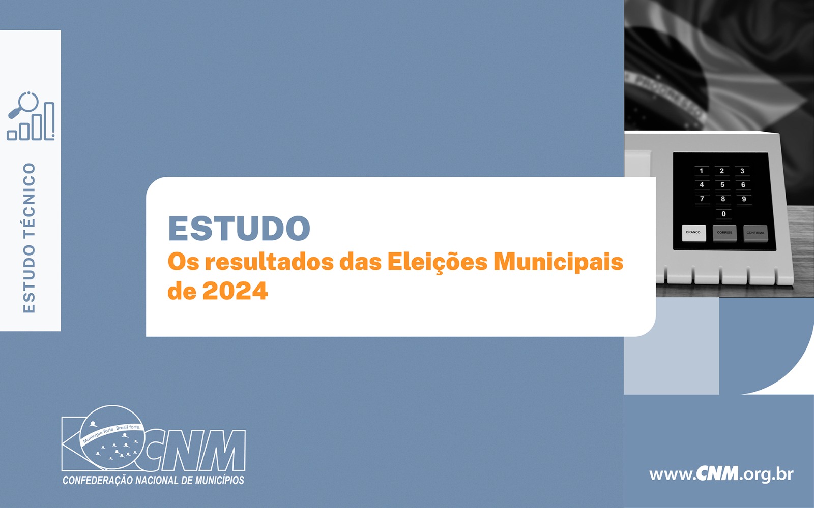 A CNM vem divulgando uma série de estudos temáticos sobre as Eleições Municipais de 2024. Os oito primeiros volumes tratam das características dos candidatos, do eleitorado, do fenômeno de candidatos únicos, das disputas partidárias e do resultado das Eleições em 1º turno.