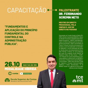 Com o tema “Fundamentos e Aplicação do Princípio Fundamental do Controle na Administração Pública”, a palestra será ministrada pelo juiz do estado do Paraná Ferdinando Scremin Neto.